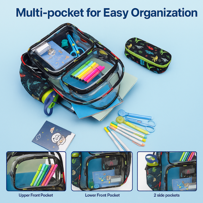 This Transparent School Backpack Set is helpful for learners and activity organizers looking for clear solutions. The Clear PVC Backpack offers instant visibility so users can confirm packed items quickly. Reflective Strap Backpack accents help increase attention during commutes. Padded Strap Backpack features allow kids to carry it without strain. With two bags in each set, users can rotate use between days or assign one per task. The structure is lightweight but holds shape. Compartments help separate tools and books for smoother organization. The surface is simple to clean and dry making it a strong choice for regular schedules.