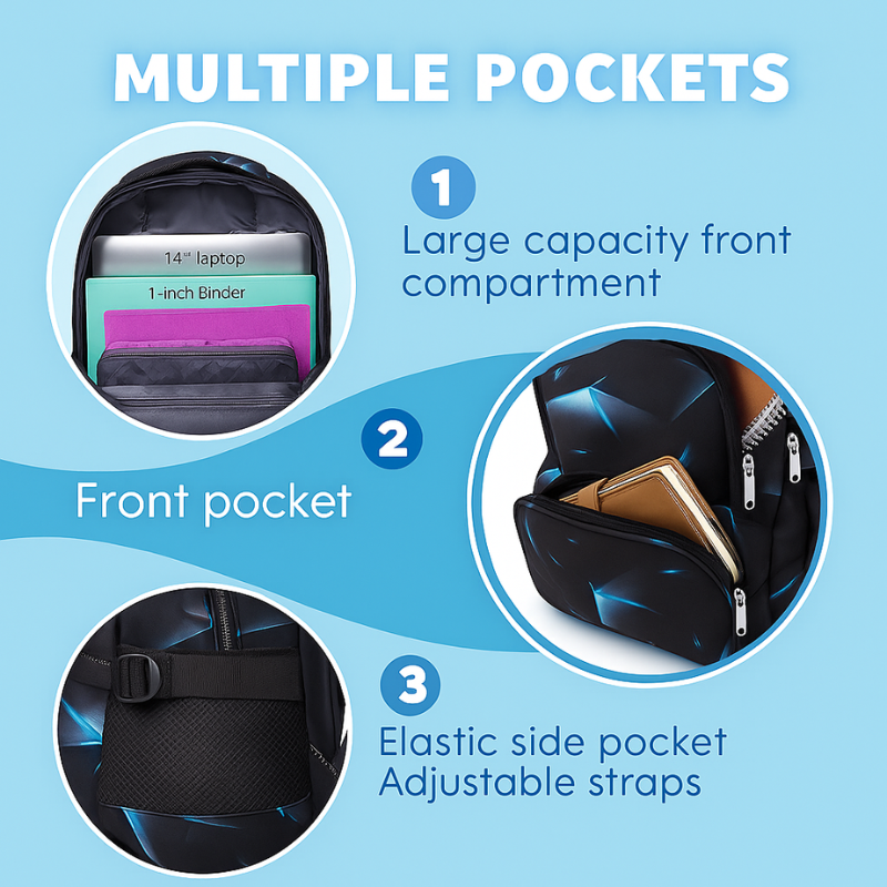 Multiple compartments make organizing supplies simple. Books, folders, and notebooks fit easily.