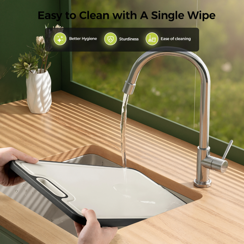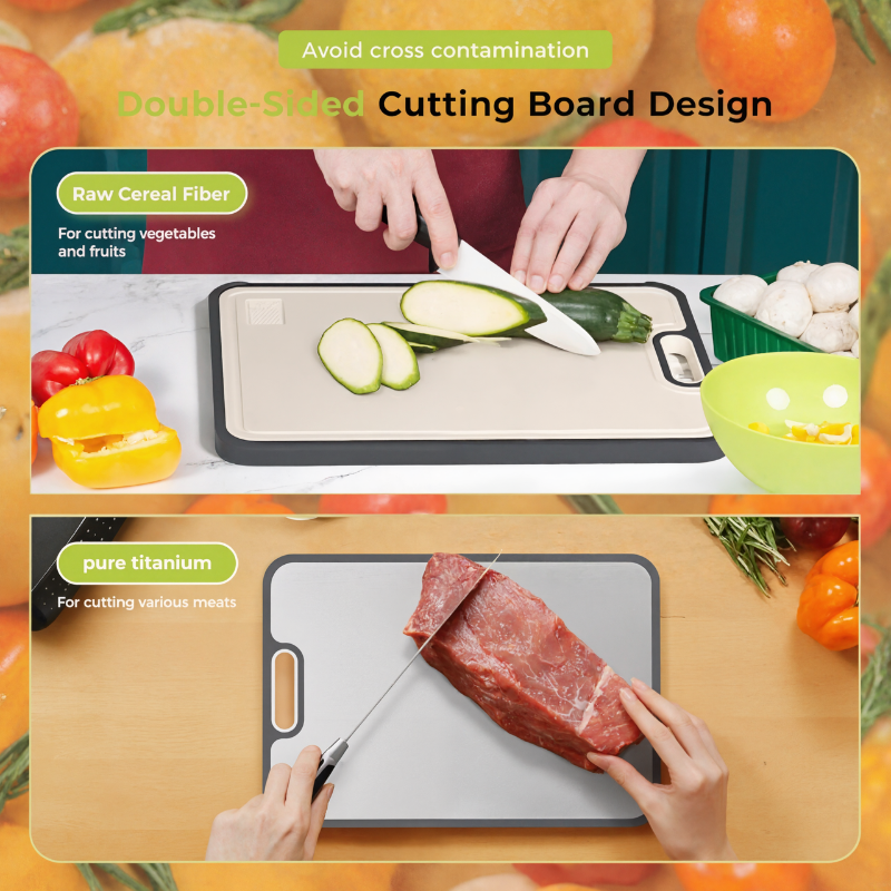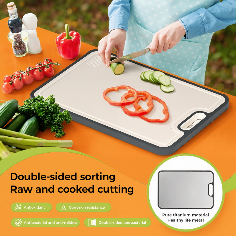 One side uses 99.9% titanium, while the other is formed from wheat straw PP material. This configuration allows users to flip between two distinct cutting environments based on ingredient types. The titanium surface supports slicing heavier ingredients, and the reverse side accommodates vegetables or fruit prep. Switching tasks is quicker and cleaner than with traditional single-layer designs.